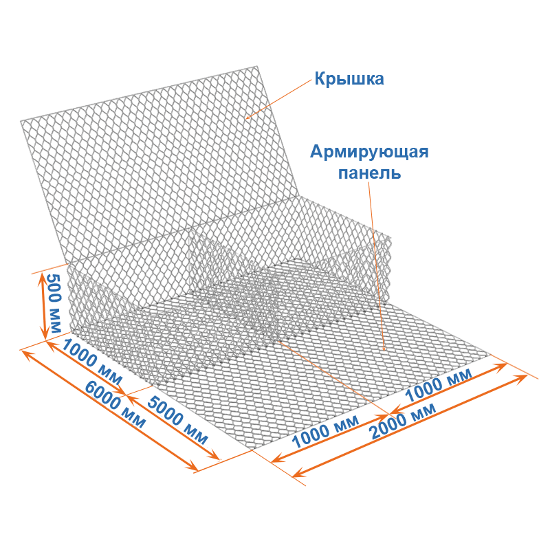Габион с армирующей панелью 6x2x0,5 – это коробчатый габион, состоящий из основной части (короба) и армирующей панели (хвоста). Изготавливается габион из сетки двойного кручения.