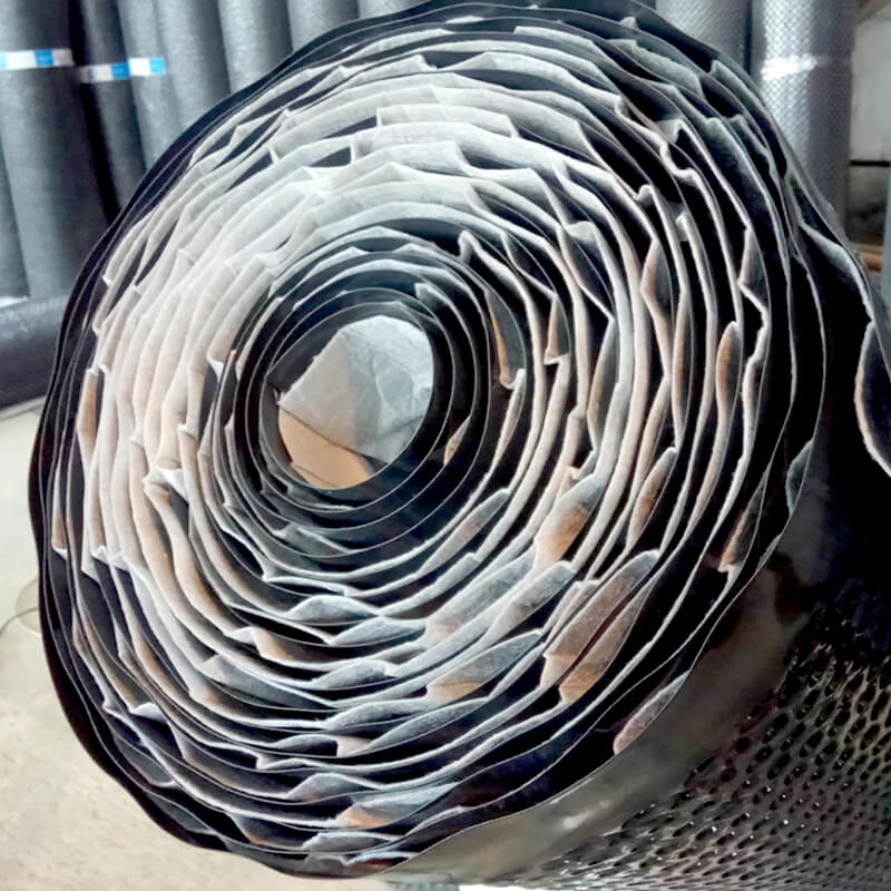 Профилированная поверхность с выступами в форме усеченного конуса высотой 20 мм создает равномерный дренажный канал между конструкцией и грунтом. Геотекстиль, закрепленный на верхнем основании выступов, пропускает воду в дренажный зазор, но задерживает частицы грунта, предотвращая заиливание. Это позволяет системе эффективно отводить воду, снижать гидростатическое давление на подземные элементы и защищать гидроизоляцию от повреждений при обратной засыпке и эксплуатации.